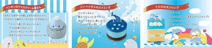 - 詰め合わせ内容:<わんぱくアザラシくん>黒ゴマホイップクリームのタルト、<おさんぽウミガメくん>メロンホイップクリームのタルト、<ヤドカリじいさんの家さがし>さくらんぼホイップクリームのシュークリーム、<クラゲの美しい夜>3種のフルーツを飾ったぶどう風味ゼリー、<のんびりメンダコ>チーズ風味ホイップ&マンゴーホイップクリームのタルト、<イルカの大ジャンプ>白桃ダイス入りライチホイップクリームとソーダ風味ジュレのケーキ、<ペンギンのアイスクリーム屋さん>ヨーグルト風味とソーダ風味ホイップクリームのロールケーキ、<カラフルサンゴのオーケストラ>ピーチホイップクリームと苺風味スポンジのケーキ、<ジンベイザメのスイミング>ソーダ風味ムースケーキ