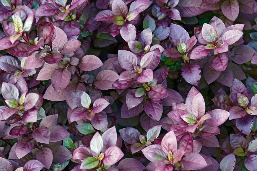 多くのカラーがありますが、シックな赤紫色の「パープルプリンス」や銅葉が美しい「パープルナイト」など、ダーク系の葉色を選ぶとナデシコの花色がしっかり引き立ちます。近年はオシャレな斑入りも増えていますので、ぜひチェックしてみてください。