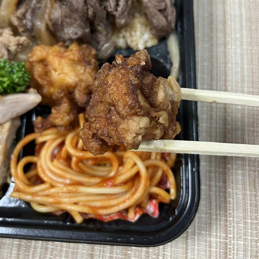 重量はしっかりと1.2キロ超え。鶏照り焼き・豚焼肉・牛ハラミ・唐揚げがあふれんばかりに盛り込まれ、1200円です。ご飯だけでなく、おかずが多いのはうれしいですね。