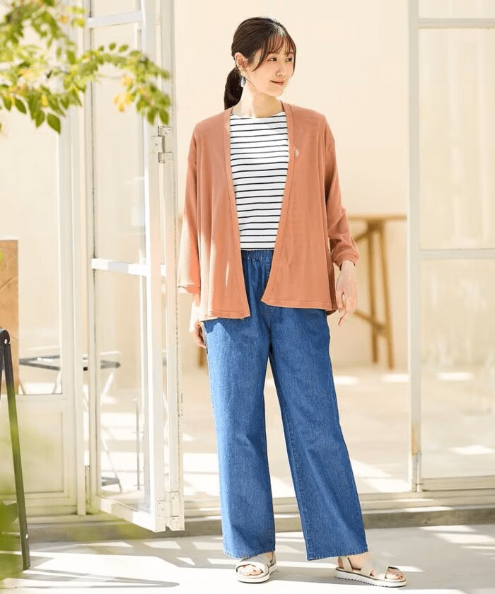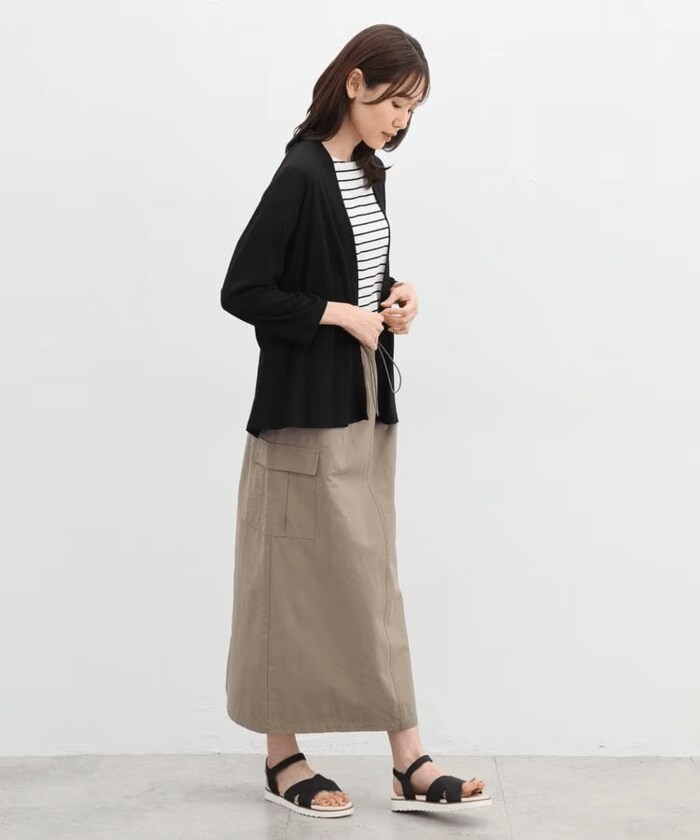 UVカット、接触冷感機能つきのボタンレスカーディガンです。ゆったりした着心地で腰回りが隠れる長さなので、体型が気になる方もスラっと着こなせます。シンプルなデザインで、どのコーデとも合わせやすいですよ。