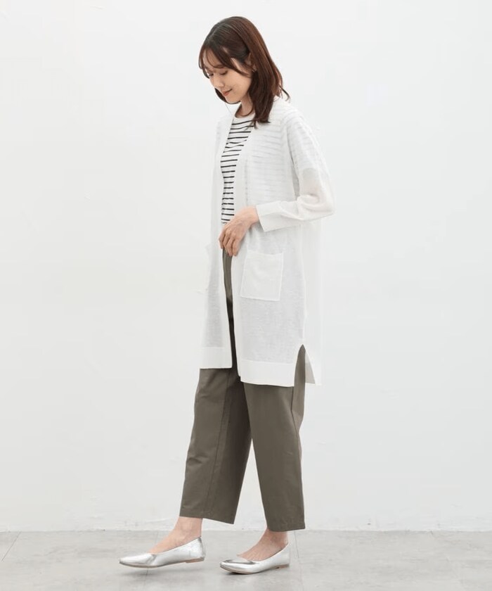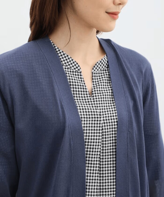 UVカット、抗菌防臭、ウォッシャブルと多機能なロングカーディガンです。ロングデザインなので、縦ラインが強調され着痩せ効果があるのも魅力的。麻混素材で、さらっとした見た目、着心地になっています。