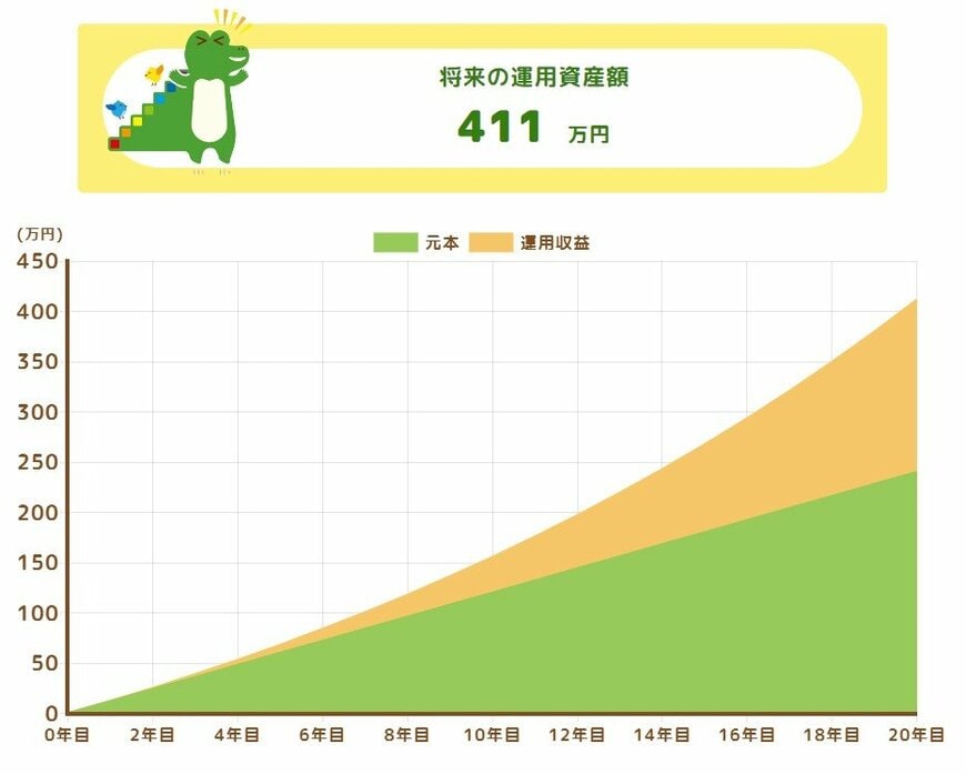 想定利回りが5%の場合、20年目の運用収益は171万円となり、積立元本と合わせて411万円となります。