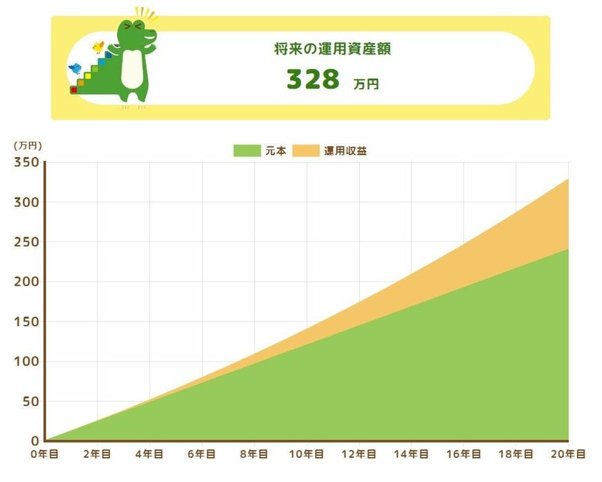 想定利回りが3%の場合、20年目の運用収益は88万円となり、積立元本と合わせて328万円となります。