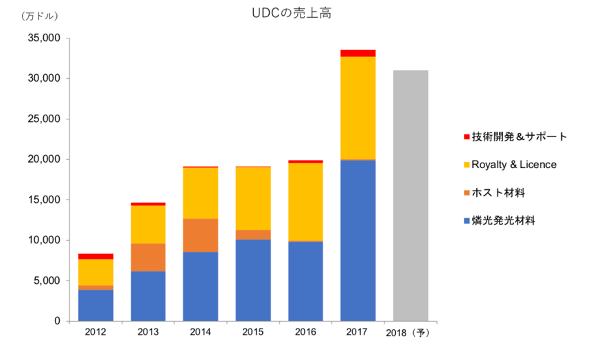 UDCの18年1~3月期業績は、売上高が前年同期比22%減の4357万ドル、営業利益は同63%減の452万ドルだった。売上高の内訳は、燐光発光材料が同46%減の2525万ドル、ロイヤルティー&ライセンス収入が同2.3倍の1591万ドル。ロイヤルティー&ライセンス収入の増加は、17年末に最大顧客であるサムスンディスプレー(SDC)と新たな契約を更新したことによるとみられる。従来は4~6月期と10~12月期にSDCからのライセンス収入を計上していたが、新契約では販売量などに応じて四半期ごとに計上するかたちになったようだ。