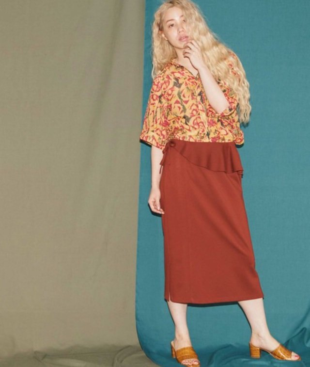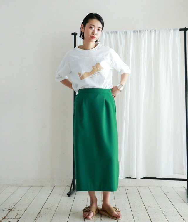 ボックスのようなゆるいシルエットで、コンサバになりがちなタイトスカートをこなれ感たっぷりに仕上げた一着。