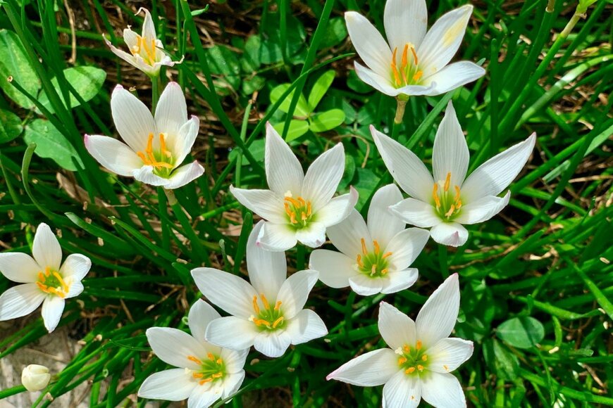 ゼフィランサスは、定番のホワイトをはじめ、ピンクやイエローの花を咲かせる球根植物です。細く長い葉は常緑で、冬でも枯れることはありません。