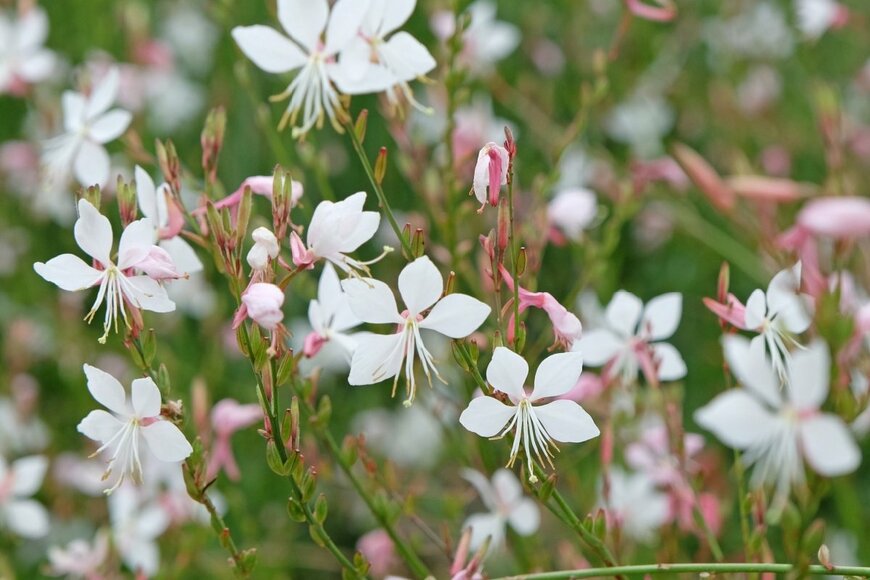 春から晩秋にかけて開花するガウラは、まるでチョウのように美しい花が咲く多年草です。別名「ハクチョウソウ」とも呼ばれますが、その可憐な名前とは裏腹に、暑さ寒さに強い強健種です。