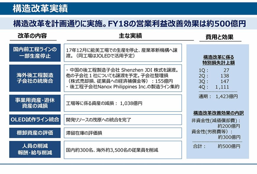 経営不振に陥っているジャパンディスプレイが構造改革の進捗と18年度見通しを発表。18年度は売上高が最大で8600億円、営業利益率は2~3%を見込む -