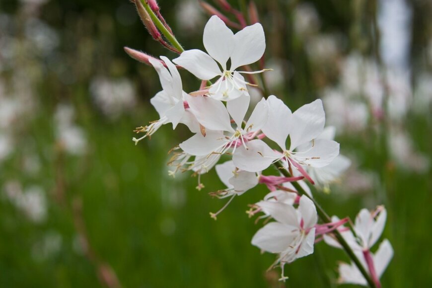 細長い茎に沿って、縦並びに可憐な花を咲かせるガウラ。花の形が蝶に似ていることからハクチョウソウ(白蝶草)とも呼ばれています。