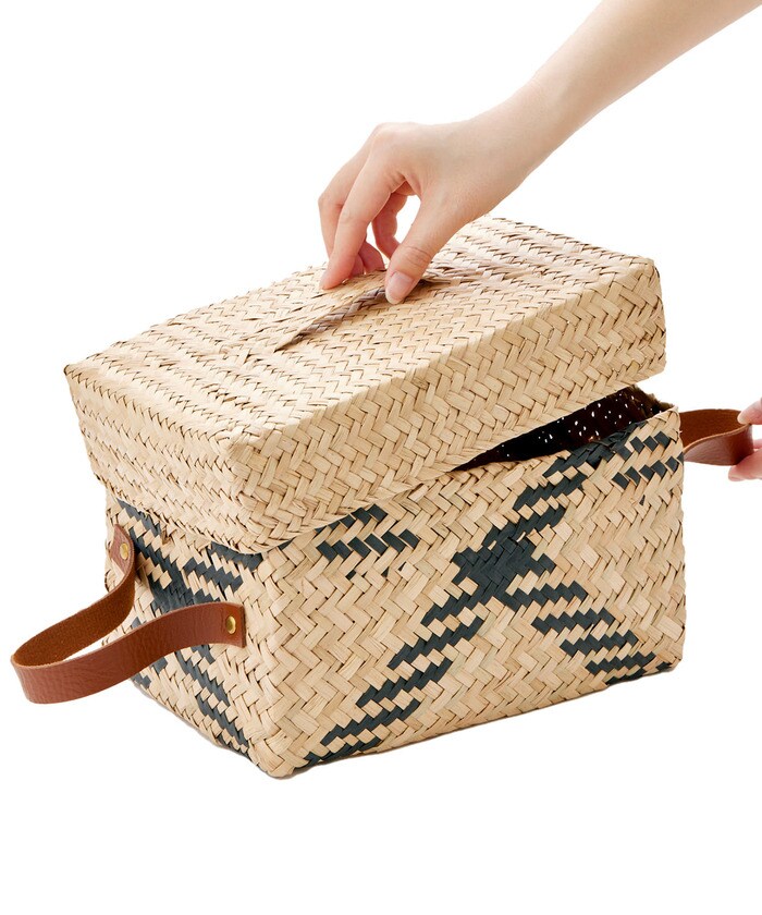 こちらのボックスは天然素材で編まれており、リゾート感あふれる夏らしい雰囲気。お部屋の中で、見せる収納としても重宝します。付属の蓋が、ほこりや虫の侵入を防いでくれるのもうれしいポイント。持ち手がついているので、さっと取り出しやすく、使い勝手抜群です。