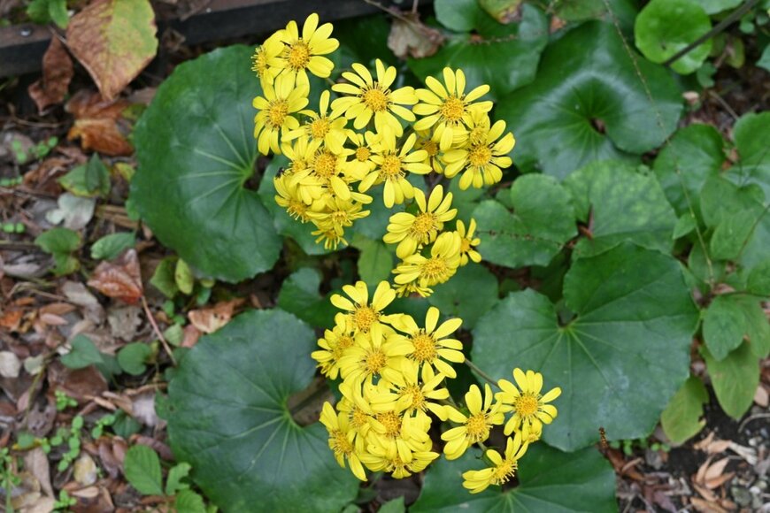 光沢のある大きな葉と黄色い花が特徴のツワブキ。湿り気のある土壌を好むので、夏の水切れには気をつけましょう。
