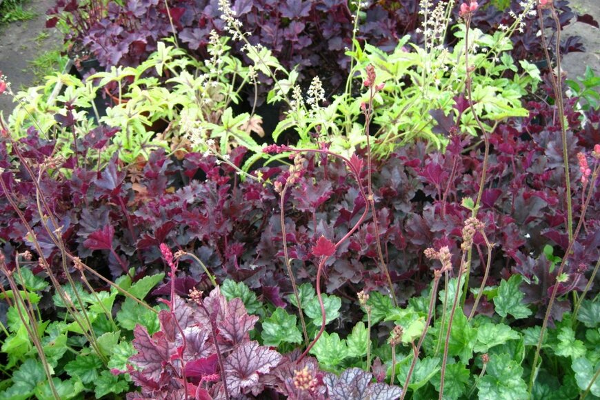 ヒューケラは、赤やオレンジ・黄色などカラフルな葉が特徴。紫や銀色の渋めの葉色もあり、シェードガーデンに華やかさを添えます。