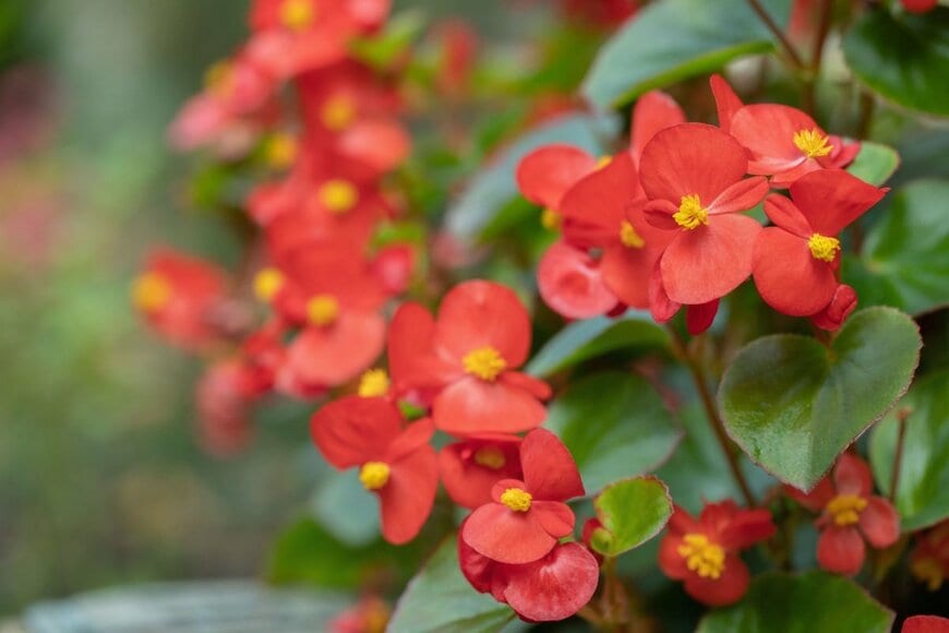 肉厚で艶やかな照りが美しい葉をもつベゴニア。色鮮やかな花が楽しめる一年草のほか、背丈が高く野趣あふれる花姿の多年草もあります。