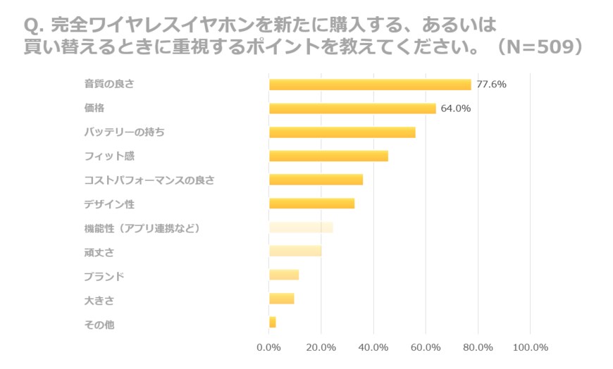 「新たに購入する、あるいは買い替えるときに重視するポイント」は「すでに所有している完全ワイヤレスイヤホンを購入したときに重視したポイント」と上位の項目は同じでした(N=509)。