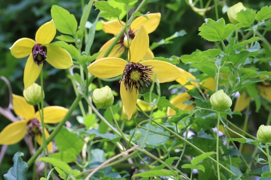 とくに夏咲きタイプはクレマチスに珍しいイエローの花が咲く品種もあります。四季咲きと組み合わせて植えると豪華な雰囲気になります。