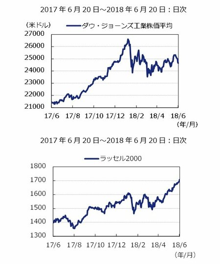 - 具体的には、ダウ指数は横ばいの動きのように見える一方で、ダウ指数と比較して中小型株寄りの指数であるラッセル2000は、このところ高値更新を続けている。