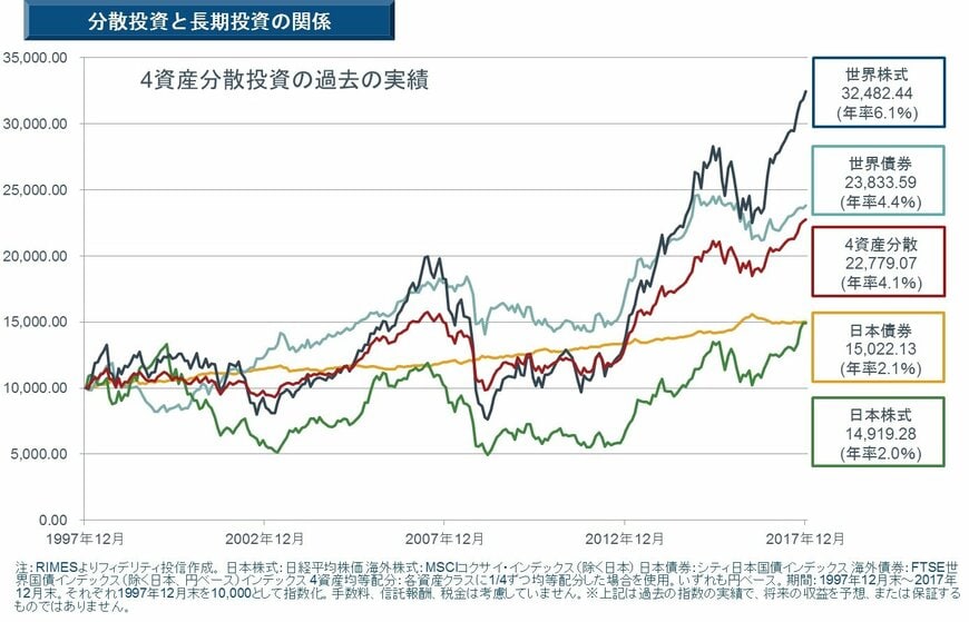 記事末のグラフは、過去20年間の4資産分散投資の実績。国内株式、海外株式、国内債券、海外債券の指数に4分の1ずつ投資をして、これを毎月リバランスした結果を見ると、2017年12月末までの20年間では、1万円で投資した金額が22,779.07円になり、年率で換算すると4.1%を達成していたことがわかる。