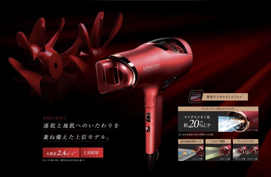 MONSTERシリーズのハイエンドモデル・KHD-W915は、独自形状のダブルファンを搭載し、驚くほどの大風量を実現。乾燥時間も従来機と比較して約40%もカットされています。(※試験機:KHD-W915/1300W、比較機:試験機と同等性能品 KHD-9802/1200W)