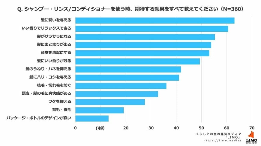 「髪に潤いを与える」が63.1%と最も多く、続いて「いい香りでリラックスできる」「髪がサラサラになる」と続きます。潤いに満ちたツヤ感のある髪やサラサラ感といった仕上がりとは別に、香りがもたらすリラックス感が2位にランクインしています。