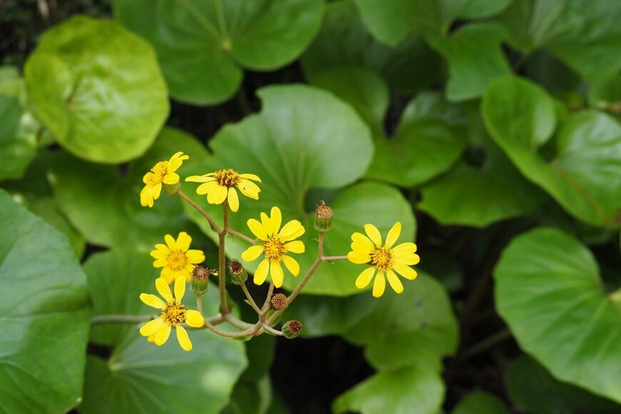 丸くツヤツヤした葉がユニークなツワブキ。常緑の多年草で、明るい日陰でも育てられるリーフプランツです。