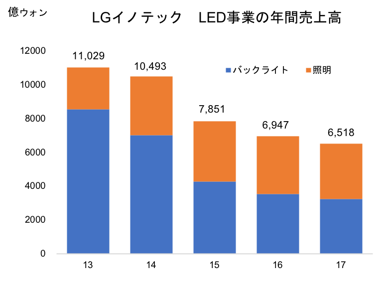 新市場を開拓していかなければいけない理由もある。LGイノテックのLED事業は、これまでテレビやスマートフォン用のバックライトと一般照明用を主力として拡大してきたが、13年に記録した売上高1.1兆ウォンをピークに、5年連続で前年割れが続いている。17年は6500億ウォンとなり、ピークから4割も下落した。親会社のLG電子が液晶テレビに代わってバックライトの不要な有機ELテレビの市場拡大に注力していることや、スマートフォン市場でシェアを落としていることなどが影響している。また、この間、中国のLEDメーカーが力をつけ、バックライトや一般照明用で既存メーカーのシェアを侵食している影響も受けている。