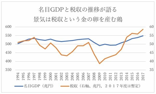各種報道によれば、昨年度の税収は58兆円台の後半であった模様です。アベノミクス前と比べて3割以上も税収が増えているのですから、素晴らしいことです。まさに、景気は税収という金の卵を産む鶏ですね。