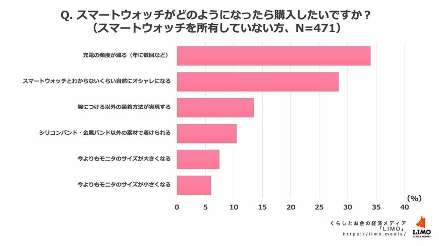 充電の回数が最も回答が多い結果となりましたが、「スマートウォットとわからないくらい自然にオシャレになる」「腕につける以外の装着方法が実現する」「シリコンバンド・金属バンド以外の素材で着けられる」などの見た目やデザイン性に関する項目を合わせると、52.4%と過半数を超える結果になりました。