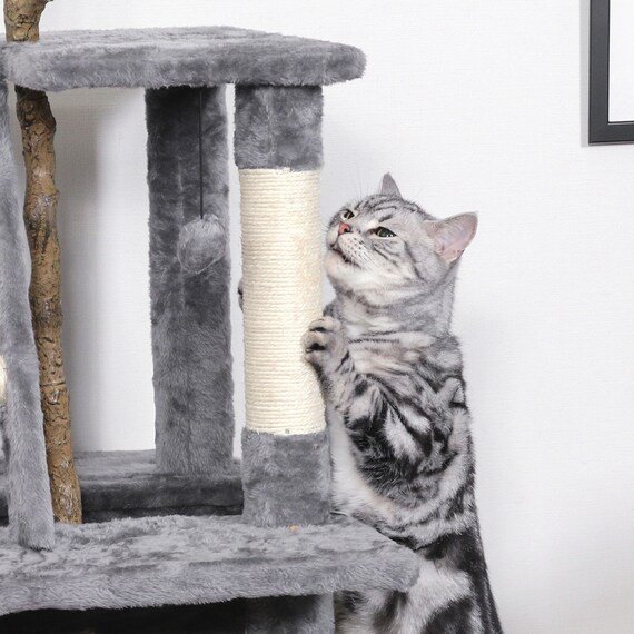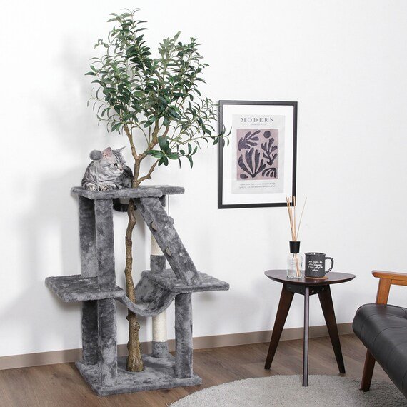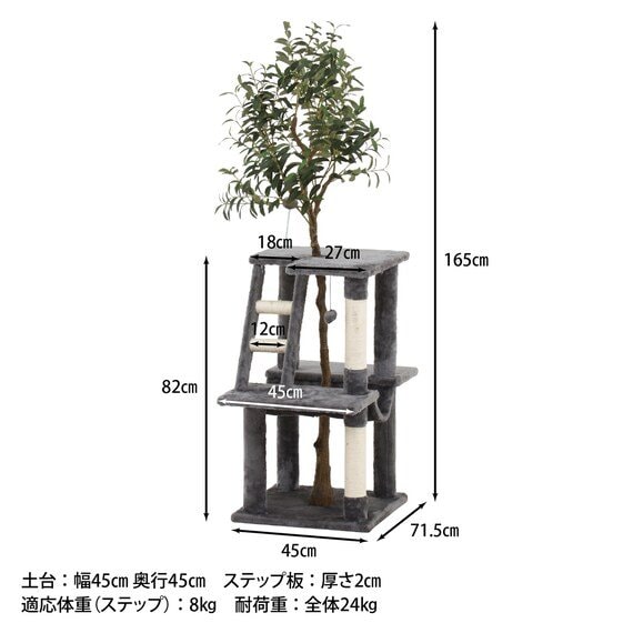 汚れの目立ちにくいグレーを基調とした心休まるカラーで、グリーンも映えてインテリアにも馴染みます。全長165cmのオリーブのフェイクグリーンが癒し感をアップしてくれそうですね。また、2か所の紐巻き支柱で爪とぎも出来ます。タワーの昇り降りを助けるステップ付き。ふわふわハンモックは大きなネコちゃんでもゆったりくつろげます。