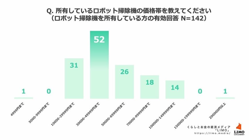 ロボット掃除機を所有している方146名の中から、所有しているロボット掃除機の価格帯がわかる方142名に金額をうかがいました。