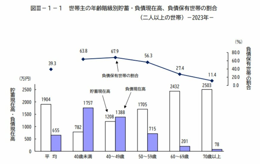 総務省の調査によると、世帯主が60歳代~70歳以上の世帯は、他の若い世代と比べ負債保有世帯の割合や負債残高が少なくなっています。