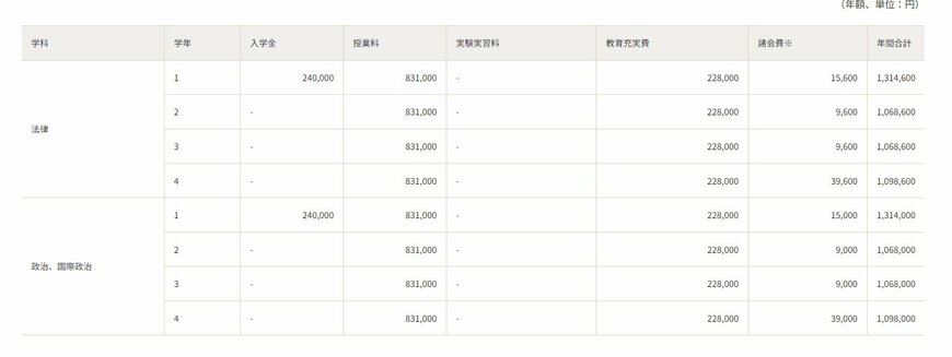 法政大学法学部法律学科の納付金内訳(いずれも年額)は、入学金24万円(初年度のみ)、授業料83万1000円、教育充実費22万8000円。それに加えて諸会費1万5600円(2~3年次9600円 4年次3万9600円)がかかります。