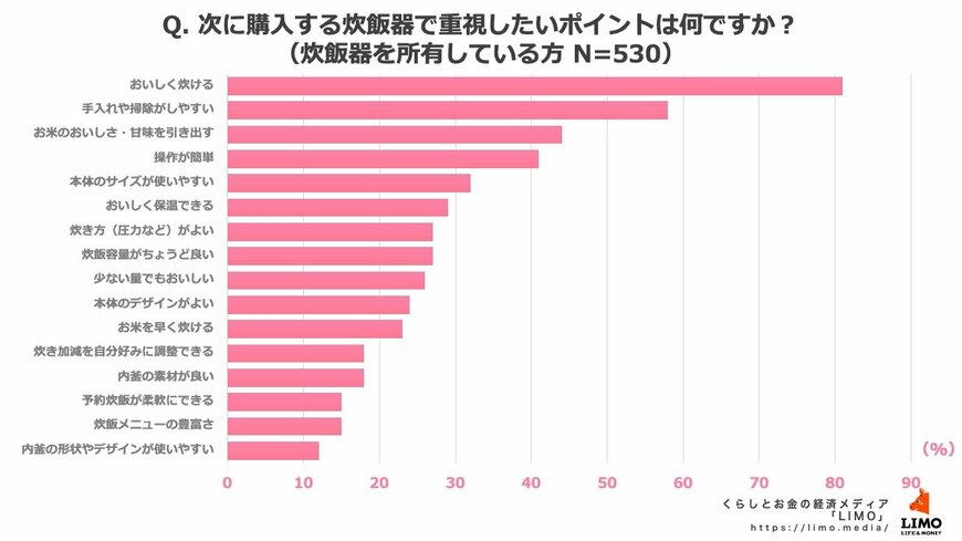 「おいしく炊ける」が80%超えとなり、2位の「手入れや掃除がしやすい」からポイントを大きくはなし1位に。3位「お米のおいしさ・甘みを引き出す」にもあるように、機能面やデザイン性よりもいかにお米をおいしく、甘さを感じられるように炊くことができるかが重要視されていることがわかりました。