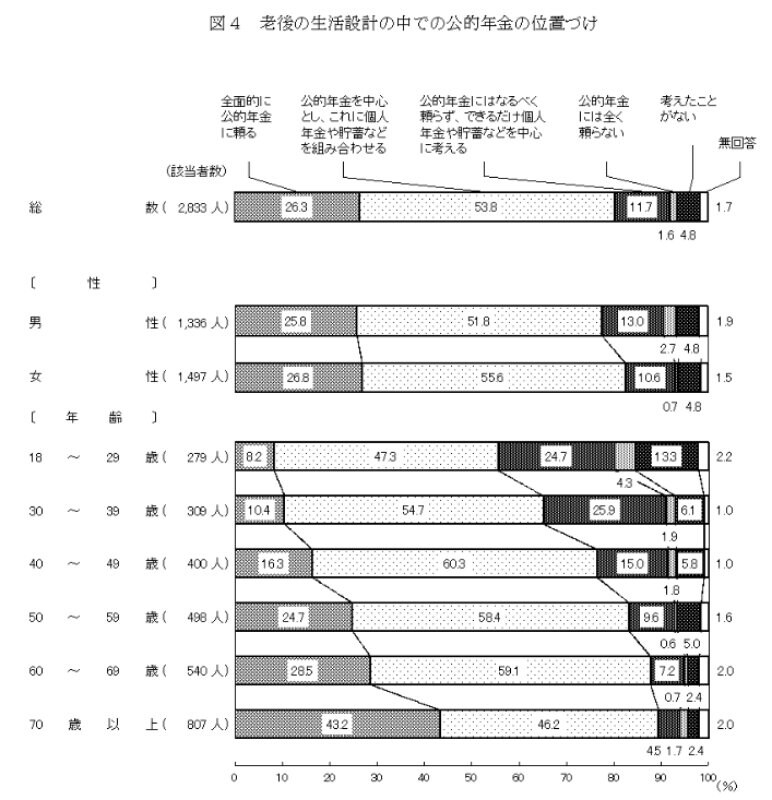 内閣府の「生活設計と年金に関する世論調査(令和5年11月調査)」によると、年齢を重ねるほど、老後の生活設計で「全面的に公的年金に頼る」割合が増加しています。