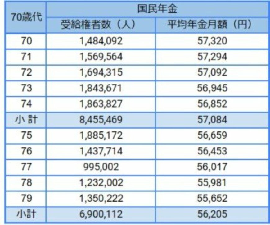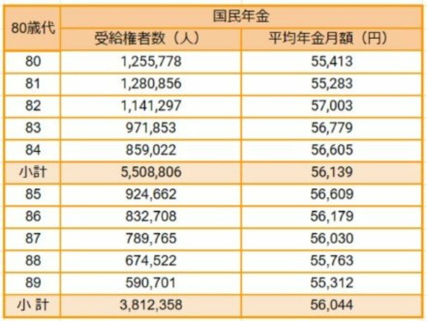 5. 【国民年金・一覧表】60歳代~80歳代の平均月額