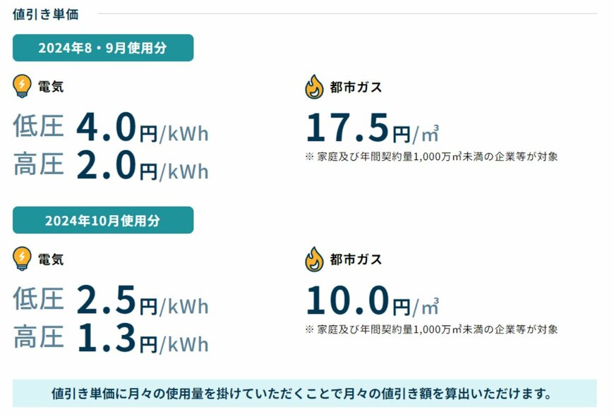 酷暑乗り切り緊急支援による「電気・ガス料金支援」は、8月・9月使用分、10月使用分で月々の値引き単価が異なります。