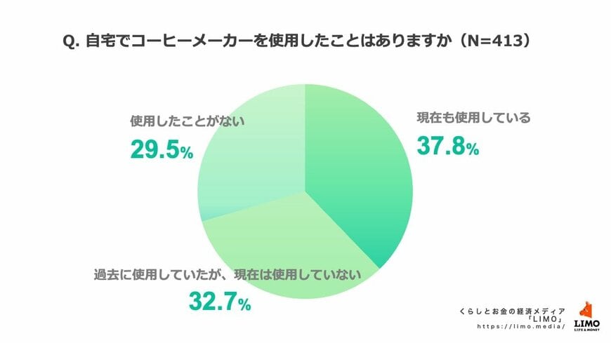 これまでにコーヒーメーカーを使用したことがある方は、回答者の6割以上という結果に。先述にもあるように回答者のほとんどが自宅でコーヒーをいただくのに、コーヒーメーカーを使用したことがない方が3割ほどいることから、今後の伸びしろを期待できるのではないかと考えられます。