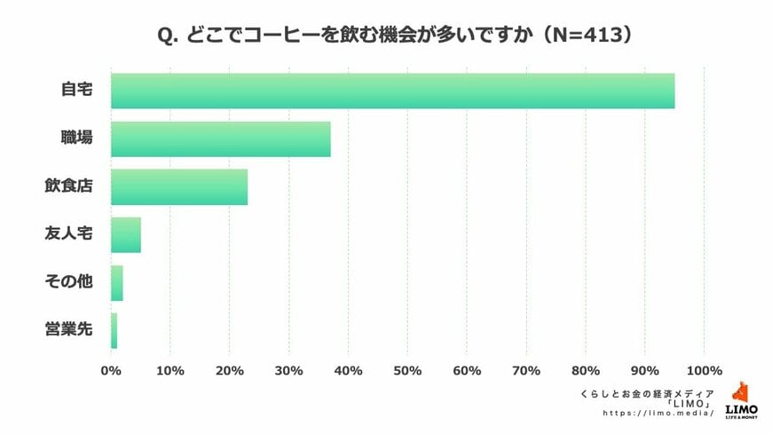 自宅は95%以上と、回答者のほとんどがコーヒーを自宅で楽しんでいることがわかりました。