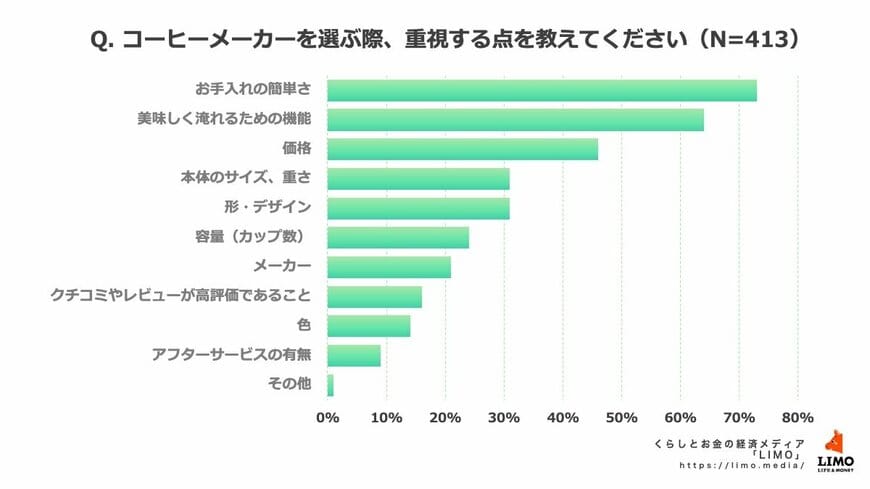 最後に、回答者全員に「コーヒーメーカーを選ぶ際、重視する点を教えてください」とうかがったところ結果は以下の通りになりました。