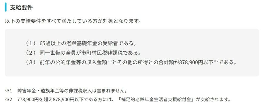 - 前年の公的年金等の収入金額とその他の所得との合計額が87万8900円以下である(前年の年金収入金額とその他の所得の合計が77万8900円以下の場合、「老齢年金生活者支援給付金」が支給され、77万8900円を超え87万8900円以下の場合には、「補足的老齢年金生活者支援給付金」が支給される)