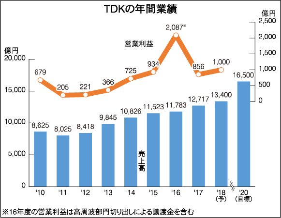 TDKはセンサー事業を原動力に、既存の受動部品事業、磁気応用製品事業、エナジー応用製品事業についても収益力を強化。17年度の売上高1.27兆円、営業利益856億円(営業利益率は6.7%)から、20年度に売上高1.65兆円、営業利益率10%以上を目指す。設備投資は3年間累計で5000億円を計画した。