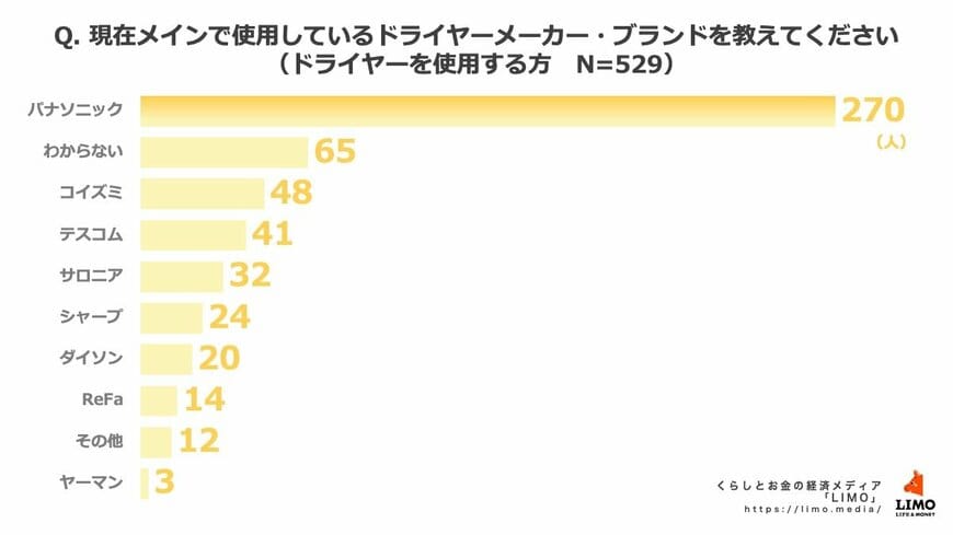 ヘアドライヤーを使用する方を対象に、現在メインで使用しているドライヤーのメーカー・ブランドを聞きました。回答は以下の通りです。