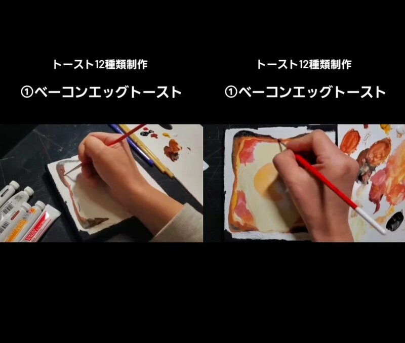 1. 【超リアルな絵】トーストアートの記念すべき第一弾!「ベーコンエッグトースト」のアート制作動画が話題!
