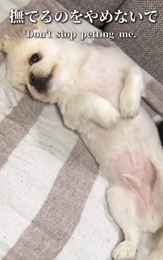 ムーチョくんはこの日も、かわいいお腹を見せてナデナデを堪能中のようですが……?