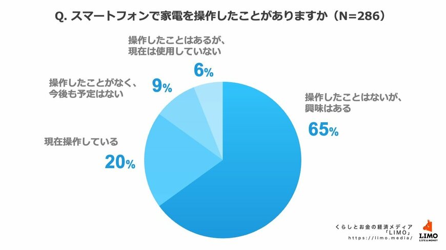 「操作したことはないが、興味はある」と回答した方が65%と多数を占めました。また、「現在利用している」層の20%を合わせると、全体の85%がスマートフォンによる家電操作に対して肯定的であることがわかります。