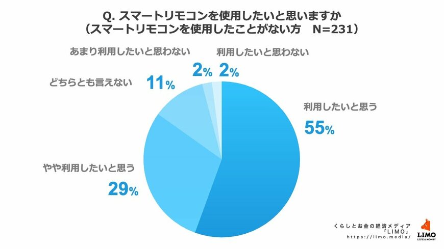 スマートリモコンを「使用したことがない」と回答した方のうち、 半数以上の55%が「利用したいと思う」と回答。さらに「やや利用したいと思う」と回答した29%を合わせると、8割以上の方がスマートリモコンへの関心があることがわかりました。
