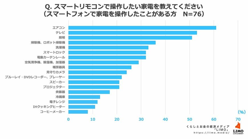 スマートフォンによる家電操作の経験がある76名を対象に、スマートリモコンで操作したい家電を調査しました。結果は以下の通りです。