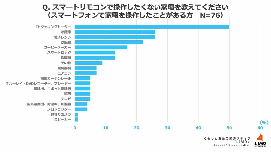 スマートフォンによる家電操作の経験がある76名を対象に、スマートリモコンで操作したくない家電を調査しました。結果は以下の通りです。