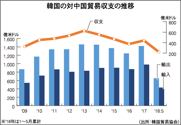 中国は17年に世界半導体取引量の65%を輸入するなど、世界最大の半導体消費国である。もし今回、中国の措置が米国のみならず、半導体産業全体に向けた狙いがあるとすれば、韓国半導体は史上最大の危機に陥りかねない。中国の矛先は、メモリー半導体市場を占有しているサムスン電子とSKハイニックスにも向けられる可能性が高い。17年の韓国の対中輸出額は1421億ドルで、442億ドルの貿易黒字となっており、この黒字の大半が半導体だといわれている。