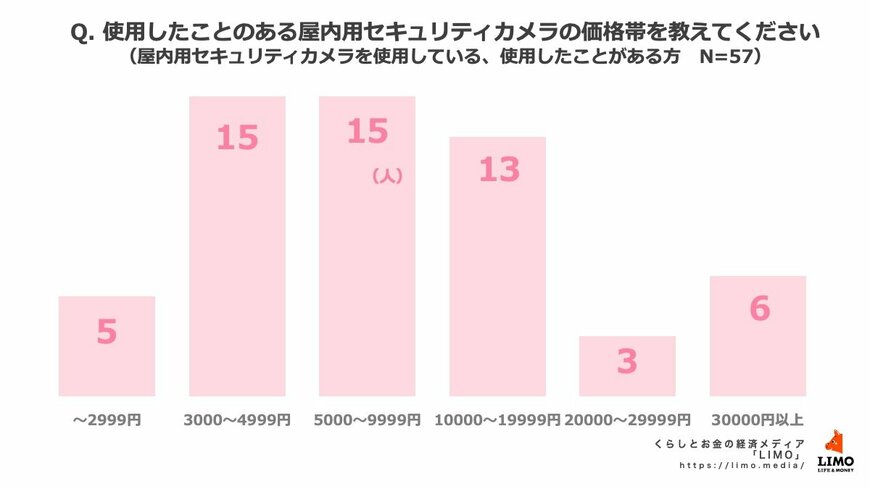 Q2で「現在使用している」「使用したことがある」と回答した方に、使用したことのある屋内用セキュリティカメラの価格帯を調査したところ、結果は以下の通りとなりました。