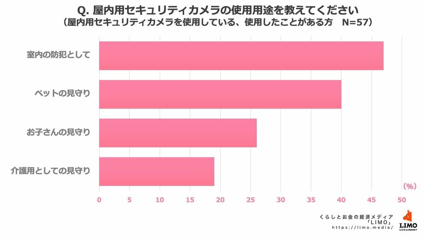 先の設問で「現在使用している」「使用したことがある」と回答した方に、屋内用セキュリティカメラの使用用途として当てはまるものを調査したところ、結果は以下の通りとなりました。